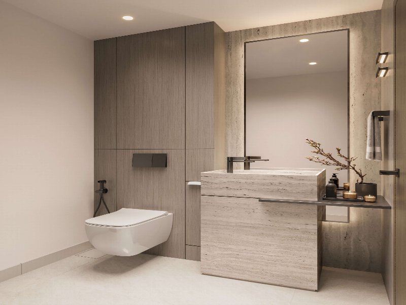 Minimalist Interiors: High-end cabinetry, premium stone countertops, and boutique-style bathroom fittings.